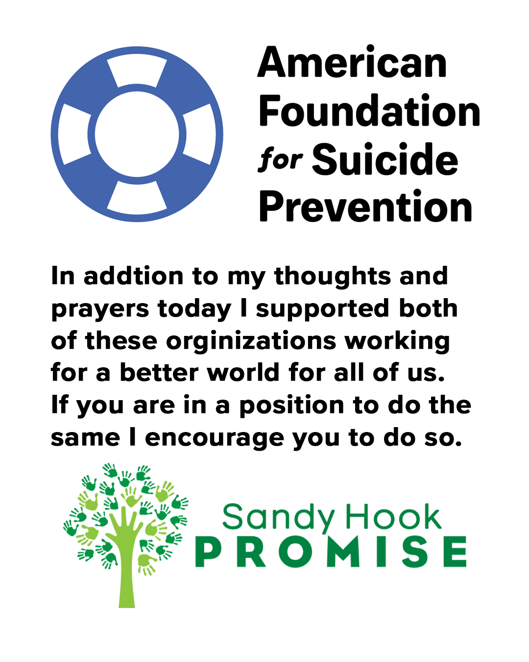 Beyond the thoughts and prayers I offer online and in person, I'm also supporting two charities in memory of the tragedy: the American Foundation for Suicide Prevention and Sandy Hook Promise. I encourage you to do the same.